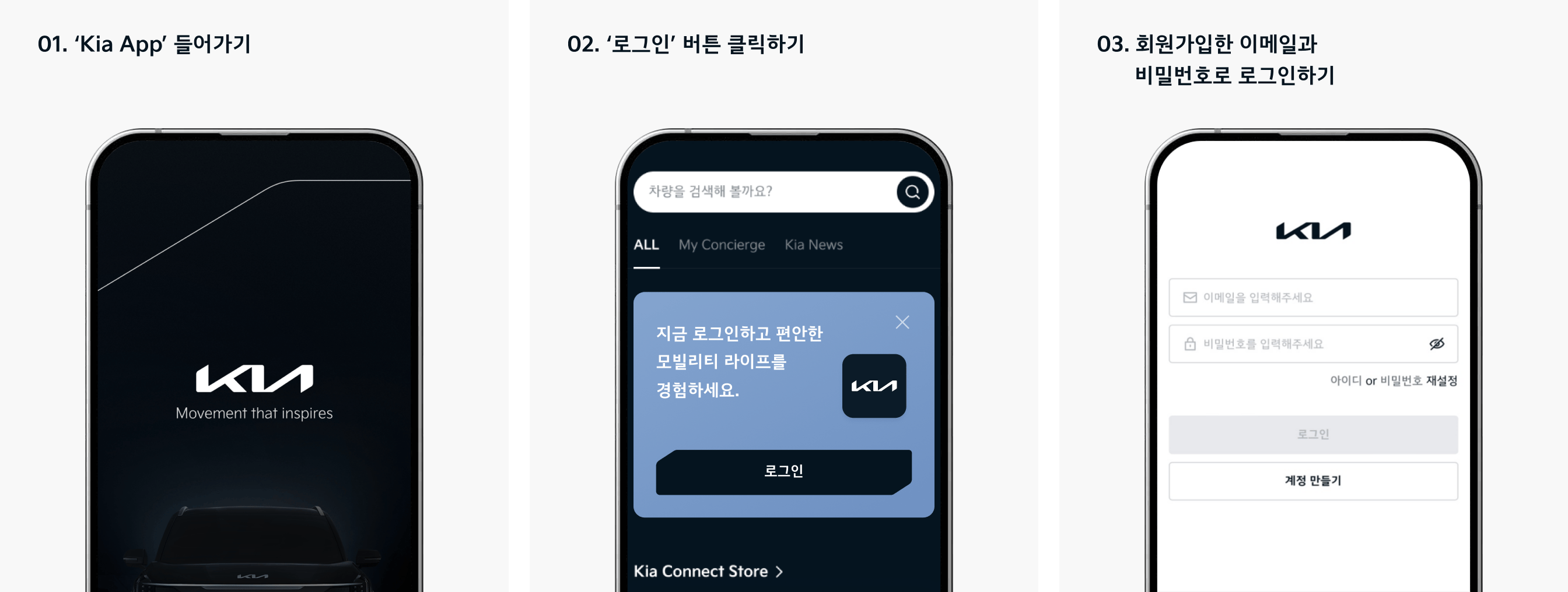 기아 웹사이트(www.kia.com)에서 회원 가입 시 동일한 계정으로 ‘Kia App’ 로그인이 가능합니다.